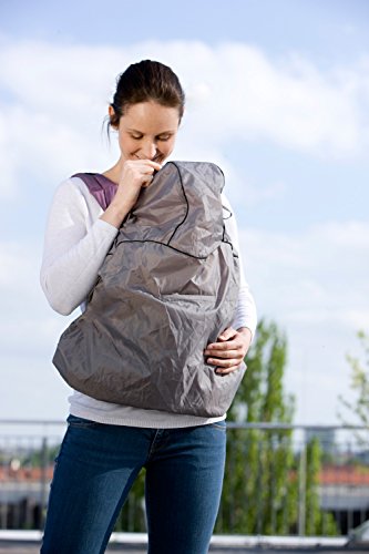 The protection against damp weather and rain. Baby carrier and bad weather? No problem. Protect your baby from light rain with 2 simple and fast manual actions. Folds together into a small and handy parcel if not used. Suitable for ALL the usual carrying systems, Mei Tais, front-, back- and comfort carriers, where the baby looks towards the person carrying. Including a tuck-away bag with elastic strap. The surface is water-repellent (PU-coated). Dimensions: approx. 60 x 75 cm. Water column: approx. 1.500 mm. Self-weight: approx. 0,12 kg. Weight: approx. 0,2 kg. Age: 0 - 4 years.