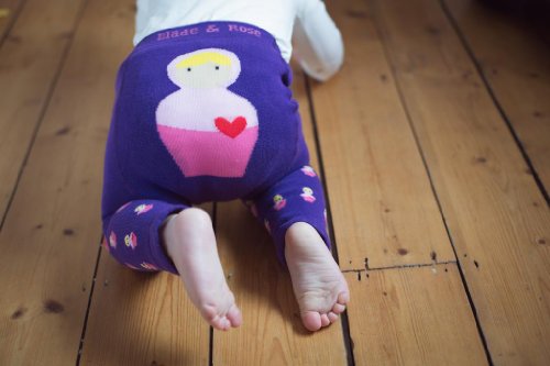 Fabulous "Babushka" Baby leggings - Purple legs decorated with mini dolls and a big russian doll on the bottom ! Wear on their own with a t-shirt, under a skirt or on really cold days under trousers...a truly versatile product! Designed by UK company Blade and Rose, these leggings are designed to solve the age-old problem of tights that don't fit properly, with no feet to worry about, these leggings fit snuggly at the gusset and "grow" with your baby, starting as full length tights and finishing as fashionable 3/4 length tights , you get loads of wear from them making them amazing value for money and little girls get cosy warm legs without any discomfort. An extra wide waistband adds to the comfort and the scalloped edged finish gives a quality touch. Made from quality yarn 75% combed cotton, 20% nylon and 5% spandex, these won't instantly go into holes and will wash well, time after time.