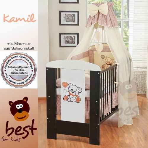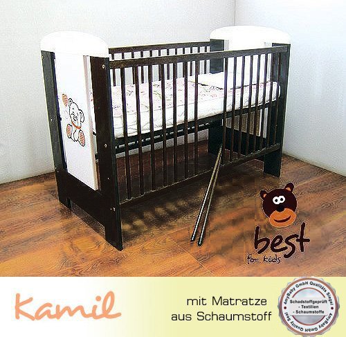 Best For Kids cot 120x60 cm beech wood with FREE foam mattress Beautiful crib for your little treasure. Unique design its grid side in wenge and white doors with bear motif.