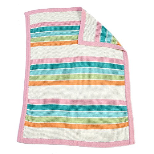 Gorgeous knitted teddy with quirky glasses and soft jersey outfit With adorable bold striped chunky cotton blanket Pram size blanket 70 x 90cm Perfect gift for any little girl