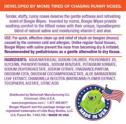 Boogie wipes are made with saline to dissolve boogies (mucus) caused by the common cold, allergies or otherwise booger-filled kid moments. Extra soft and scented in great grape, fresh scent or magic menthol (for extra stuffy noses) boogie wipes are recommended by pediatricians as a gentle, effective alternative to a dry tissue.