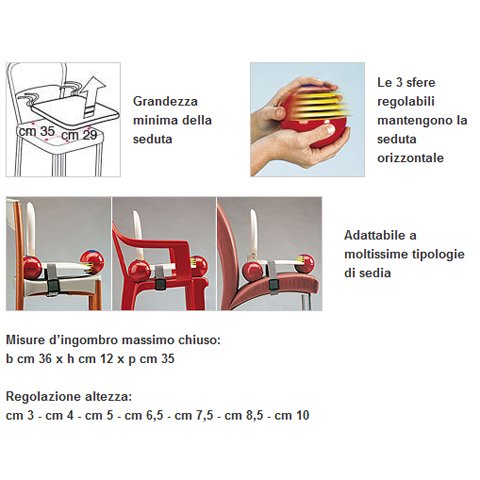 Easy fixing system via a strap of attaches to chairs for adults. Folding backrest and the carry handle allowing you to use it anywhere: at the restaurant, in the home, on holiday...