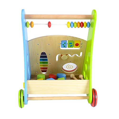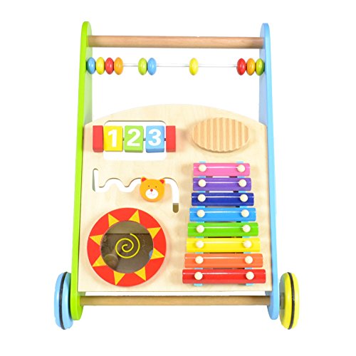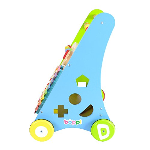 boppi wooden push along activity walkers Help your little one take their first steps with our boppi baby activity walker range. These colourful wooden walkers have a range of activities to engage and stimulate growing babies whilst aiding their transition from crawling to walking with a 4 wheeled base and smooth finished wooden push handle. The walkers provide sight, sound and touch sensory activities to encourage physical interaction and stimulate the mind. The walkers also contain a handy storage tray for the coloured wooden blocks. The boppi push along activity walker comes in two styles of activities. Musical Activity Walker: Musical Glockenspiel Musical Guiro Counting Abacus Shape sorter 8 Coloured wooden shapes Number spinner Circular Mirror Activity slider 2 Glockenspiel/guiro mallets Height: 46cm Width: 37cm Depth: 31cm Alphabet Activity Walker: Pop up peek a boo Activity slider Circular Mirror Turning dials Shape sorter 4 Coloured wooden shape 1 mini mallet Height: 49cm Width: 35cm Depth: 32cm