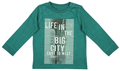 Trendy Baby Boys Lightweight Pack of 3 T-Shirt Tops. Terrific Life in the Big City Print Green Top. Blue & Cream Are Plain. Long Sleeve with popper Fastening to Neck. Great for Summer or Autumn for Layering. Superb Quality.
