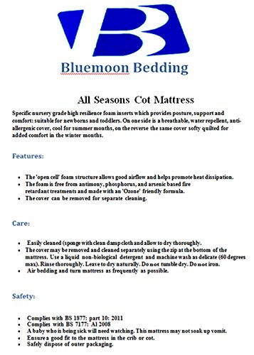 Bluemoon Bedding® Mattress Features: 25HC Compliant Nursery Foam Hypo-Allergenic Water Repellant Cover Suitable for Toddlers and Children, Breathable and Anti-Allergenic Removable Zipped Cover Machine Washable