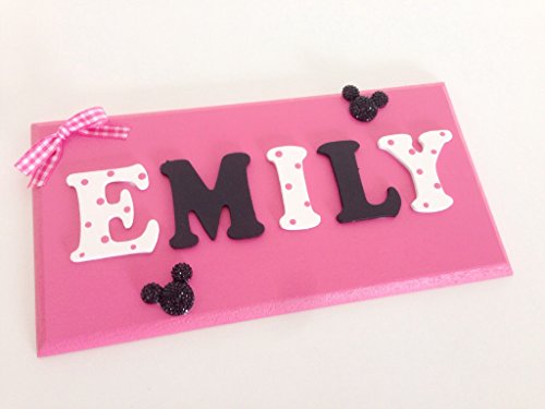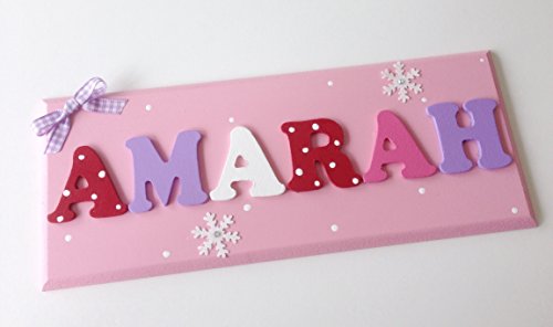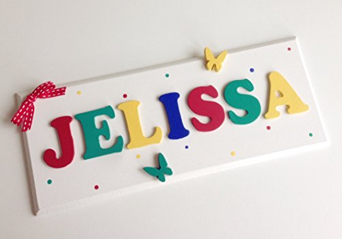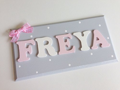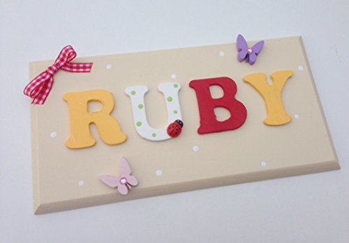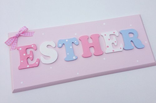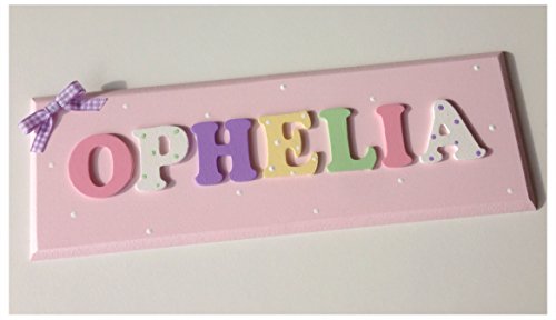 Beautiful handmade wooden name plaque with wooden letters, personalised in any name and colour of your choice My pictures show examples of colours and ideas but I can make anything to match your requirements, please message me after purchase to provide the name and colour/design choice. As these are handmade to order, please allow up to 10 working days for delivery.