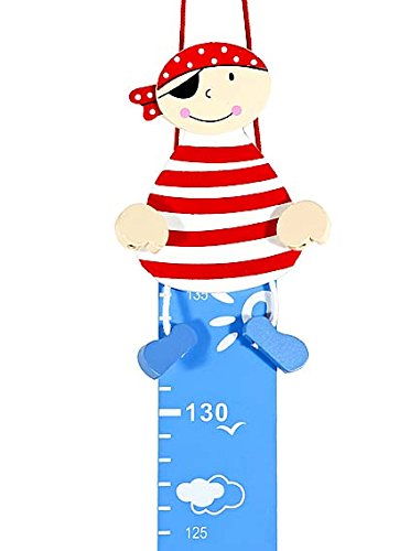 This charming handcrafted wooden height chart is from our best selling pirate themed room accessory range. This charming best selling height chart features a cheeky chappy pirate with eye patch, striped red body ,spotted headscarf and charming dangly arms and legs. The height chart has a red strong cord for easy fitting to any wall or flat surface and has metric marker measurements. The measuring chart is also not too wide so it would be perfect to attach to the end of a wardrobe or small wall area. This charming height chart would make a perfect gift and room decoration for any little boy and a great addition to any pirate themed bedroom. Matching items available in this range including photo frame, music box, coat hooks and bookends. Dimensions: L:375 x W:70 x D:35mm