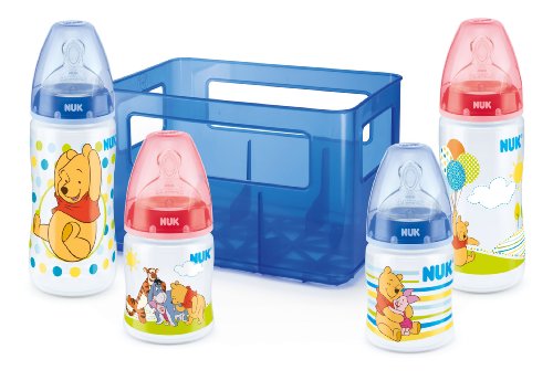 Verified Purchase This review is from: NUK Disney Winnie + First Choice Starter Set with 4 Anti - Colic wide-necked bottles ( 2x 150ml and 2x 300ml ) with silicone teat and bottle box (Baby Product)