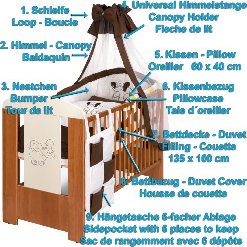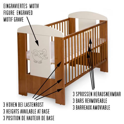 Verified Purchase This review is from: Baby Cot ELEPHANT 120x60 maden of wood incl. foam mattress and 9 pieces bedding complete set (Baby Product)