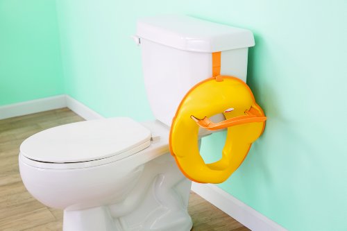 A unique "perfect fit" handle allows this potty ring to quickly and easily adjust to fit most toilet seats. Friendly ducky design and handles on the potty ring help toddlers feel comfortable and secure on the big toilet, and an integrated splash guard and easy-to-clean design makes potty training easier for mom, too! Comes with a hook to hang it on the side of the toilet for convenient, space-saving storage. Quick and easy to put on and take off