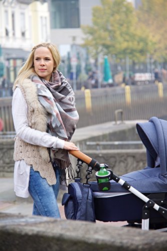 I got this cup holder to attach to a buggy and it has done a great job. It comes in two parts – the cup itself (ready assembled and the holder). You simply hook the holder onto the side of the buggy handle, and secure in the cup. It makes trips out easier and the bottle is kept upright so no spills.