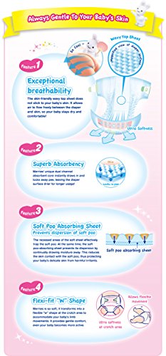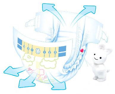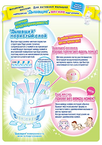 Japanese diapers Merries NB (New Born) for smallest babies (up to 5 kg) Light and comfortable Merries newborn diapers will give the pleasant feeling of comfort for every baby. The inner layer of diapers made from soft cotton and contains natural extract that protects the baby skin from irritation. The diapers ideally suit the baby body and the parents can be sure that their baby can comfortably move wearing the diaper. No worries about leaks as well, this is what makes Merries brand proud. The use of natural components in manufacturing eliminates the skin irritation. It is known that the newborns pee more often, and the moist indicator on every diaper is a great help for parents. You don't have to think when it is better to change the diaper and you don't waste your precious time to check the diaper. It all comes very easy when parents chose Merries diapers for their children! ???????? ?????????? Merries NB (New Born) - ??? ????? ????????? (?? 5 ??) Wide absorbing layer The absorbing layer is wider, longer and more flexible than for diapers produced in Europe, eliminating any hardened creases that would rub against baby skin. Soft like fabric These diapers - like other Japanese diapers - resemble soft fabric. The diapers will not form hard edges at the folds that would rub against baby skin. Double protective gathers Double protective gathers around the thighs reliably prevent leaks, but do not cause discomfort to the baby as they are soft and gentle. Convenient for parents: The reusable velcro seals are narrow so they can be closed slightly diagonally adapting the diapers to the baby's curves. Moreover, they are soft and breathable, leading to the less likelihood of the "greenhouse" effect in the area of tummy. Wetness indicator gradually changes colour from yellow to blue. The blue indicator means it is time to change the diapers.