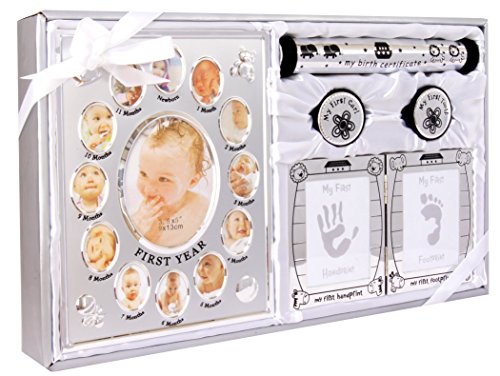 New 5 Piece Baby Keepsake Gift Set suitable for Unisex, Boy, Girl, First Photo Frame, Curl and Tooth Box, Handprint Footprint Prints Kit. Available in Pink, Blue and Silver. (SHINY SILVER) is available in Gift Sets