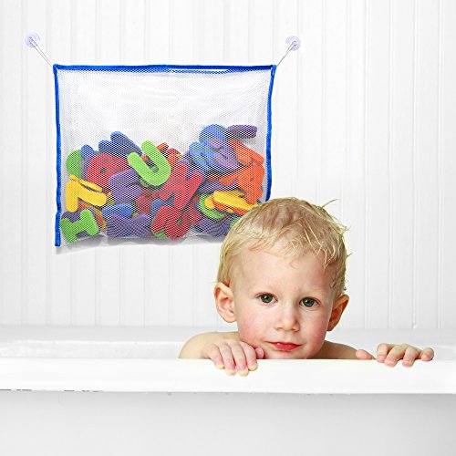 Contains: 26 floating letters and 10 numbers. High quality large (14X18 inch) mesh organizer to store all your bath toys.