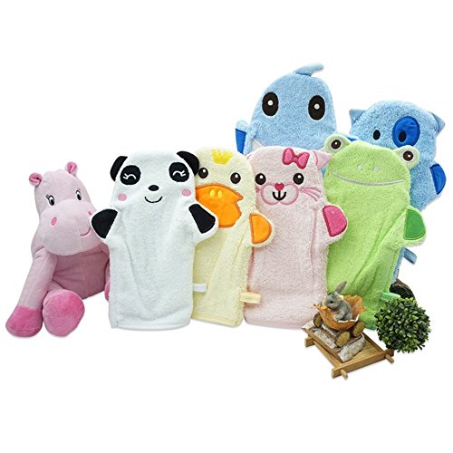 Adorable terrycloth bath mitts featuring five favorite animals: Duck, Panda, Dog, Cat, Frog and Shark. Use as bath mitts or as puppets. Generous sizing fits most adult hands. Each puppet bath mitt features a convenient hanging loop for easy drying. These adorable puppet bath mitts are perfect for bath time, play time or any time.