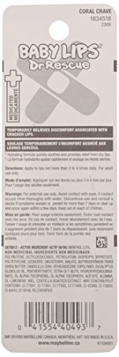 Maybelline New York Baby Lips Dr. Rescue Medicated Lip Balm provides care that soothes sore lips with a hint of eucalyptus and combats dryness. It's available in natural tints to even out lip tone for healthier looking lips. In one minute, lips feel soothed; in one day, lips look less dry; in one week, lips are reborn based on panelists' self evaluation. Maybelline New York Baby Lips Dr. Rescue Medicated Lip Balm Medicated care in natural tints Soothes quickly with a hint of eucalyptus 12 hour hydration. Net Wt. 0.15 Oz 4.4g