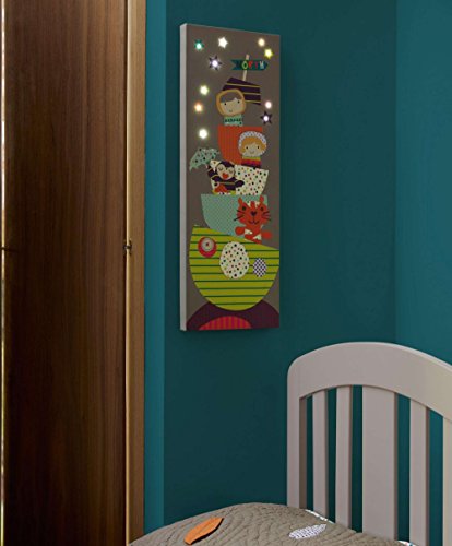 This stunning canvas picture features the cute characters from our interiors collection. Twinkling LED lights are guaranteed to add that extra sparkle to any nursery bedroom or playroom. Why Buy Me Gorgeous decoration to brighten up any wall Easily attaches to most wall surfaces Easy to switch on and off as desired Fitting Advice No wall attachments are supplied with this product. This is because the type of fitting required is determined by the wall composition. Ensure the fittings used to hang the product are correct for the type of wall to which the product is to be fixed. If you are in any doubt about the correct type of fittings to use consult a professional before attempting to hang the product. PLEASE NOTE This is not a toy. Keep out of reach of a child. Wipe Clean only Size H70cm x W 25cm x D2.5cm approx. Requires 3 x AA batteries Frame wood. Fabric printed canvas PLEASE NOTE Cot/bed side removed for illustrative purposes only.