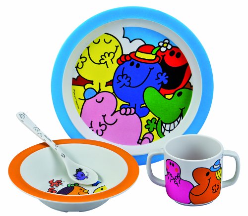 This is a colourful idea for a birth gift. This set featuring Mr Men includes a Plate, Bowl, Spoon and double handled Cup. Features the ever popular Mr Men characters by Roger Hargreaves. Dishwasher safe but not suitable for microwave. Care instructions on box are in French/German.