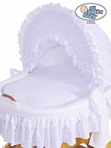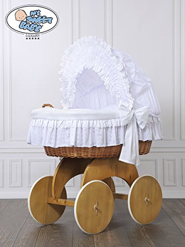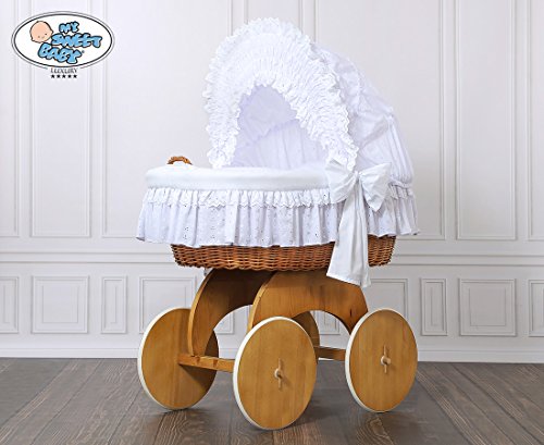 NEW LUXURY HOODED WICKER CRIB ON SOLID WOODEN STAND, COMPLETE BEDDING SET WITH LOVELY LACE + QUALITY BRITISH MADE MATTRESS *the biggest lying space 85 x 45 cm allows using the crib longer *suitable from birth to 9 months approx. *handmade basket made of healthy, natural wicker *solid wooden base with large wheels and rubber tyres that leave no marks on the floor *British made mattress and complete bedding set included *mattress size 790x460x40mm - confirms to BS1877 part10 and BS7177 *bedding: 100% Cotton; filling: 100% Polyester Dimensions: L95cm x W63cm x H126cm All elements of bedding and mattress cover can be easily removed and mechanically washed. Outer fabric is certificate of quality and safe textiles of ÖKO-TEX certificate. PLEASE NOTE WE NEED UP TO 10 WORKING DAYS FOR DELIVERY If you wish to purchase different design please have a look at our other listings. Please have a look at our other listings of cot beds, cot top changers, bedding sets and more.. **Customers from Republic of Ireland, Isle of Weight, Channel Island, Isle of Man, Isle of Scilly, Scottish Islands please do contact us before purchasing.