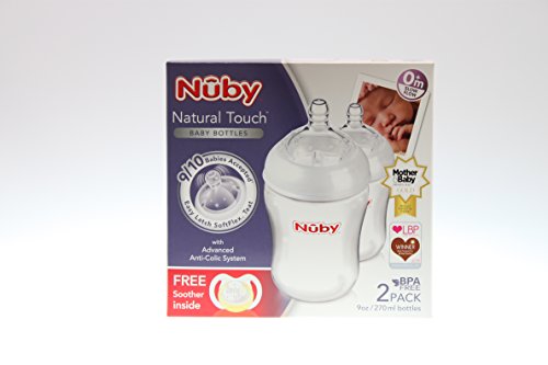 Nuby natural touch 270ml bottles (with slow flow teat) come with a free soother and new super soft teat inspired by the shape, texture and natural flex of mum's breast.