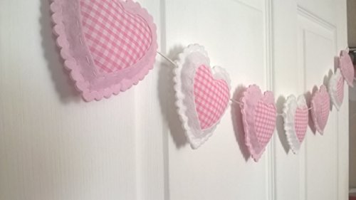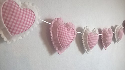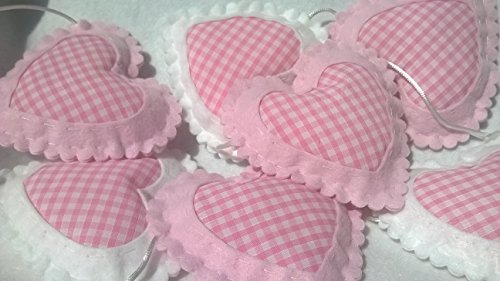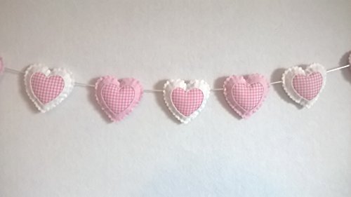 Beautifully hand crafted heart bunting. Hearts slide across the nylon cord for adjustable length. Loops on either end for easy hanging. Finished with a hand made charm. Will add the finishing touch to any baby girls nursery or bedroom. Can customise lengths if you need longer and add extra hearts at £1.00 per heart. Can also make in hanging tree decorations or as single hearts.