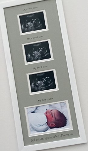 This is a stunning personalised product for a new arrival gift or nursery decor for a new baby boy or girl. Capture baby's first moment into the world, add photo and ultrasound scan photos in our personalised triple scan picture frame. Colours of the mount is grey or white of your choice, it will blend in with any colours in the baby nursery room.