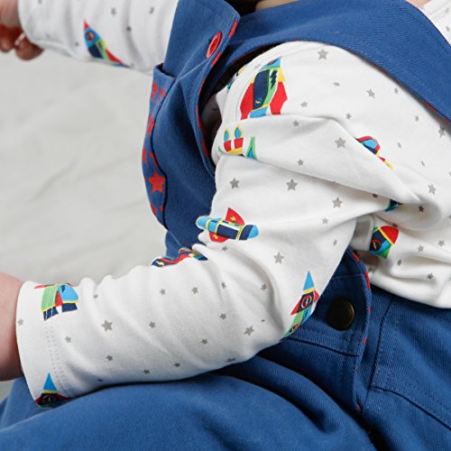Blue with Red Star and cosy. These woven boys dungarees have adjustable button up straps and a fab red star pocket on the front. Look great layered with our new Autumn funky long sleeved tees.
