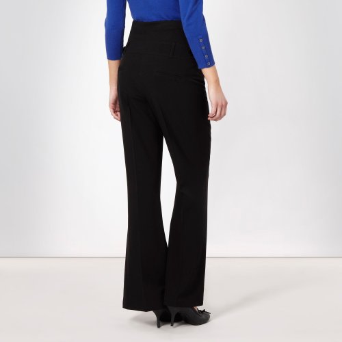 These essential workwear smart black maternity trousers from Red Herring Maternity fit over the bump with a jersey section across the waist, and feature buttoned side tabs between their belt loop