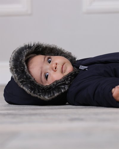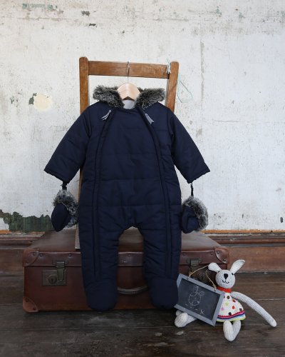 So Essential! This delightful padded Snowsuit will wrap up your little Bunny and keep them toasty warm. With a quilted outer and super soft fleece lining it is really soft against baby's skin. The front has a double zip opening for easy dressing and the removeable mittens are ideal for colder weather. The fur trim hood frames your new baby's face beautifully! 100 % Polyester outer / LIning . EO135