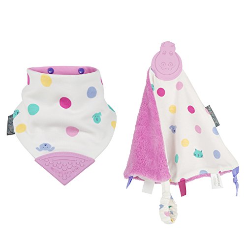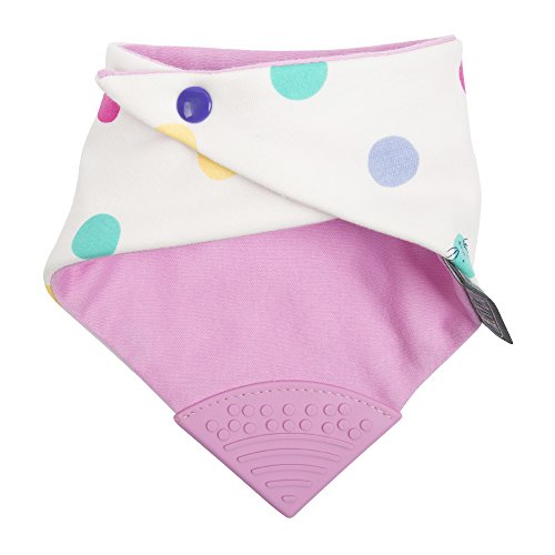 Cheeky Chompers has collaborated with British family lifestyle brand Joules to launch new stylish additions to the award-winning Neckerchew range. Cream with pink, lilac, green and yellow cat and dog spots with a dusty pink reverse. Attached dusty pink teether. The World's first chewy dribble bib for teething tots! The latest innovation in baby and toddler teething products, the unique design combines the popular dribble bib concept with an attached chewy teether to sooth painful young gums. This prevents the problem of babies dropping teethers on dirty floors or loosing them when out and about. Available in 15 different colours and designs, each Neckerchew is fully reversible. The bibs are made from super soft jersey cotton and have an absorbent middle layer to lock in moisture away from small chests. The textured triangle gives great bite using an innovative dimpled design to massage and sooth tender gums and encourage new teeth to break through. The teether contains no phthalates, will never flake or peel and is 100% safe for babies to chew on. Secured with a double popper fastener, the Neckerchew can expand to grow with your baby. Machine washable at 40 degrees.