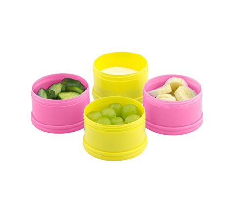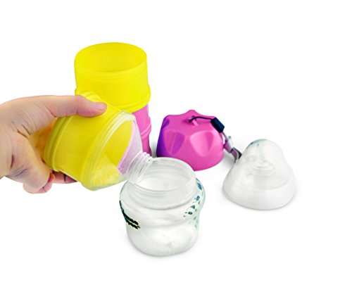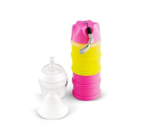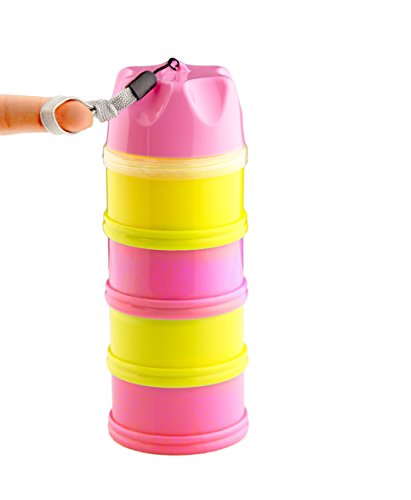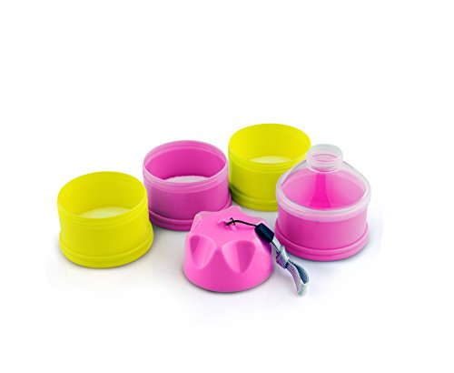 Verified Purchase This review is from: Tootsy Boo Formula Milk Powder Dispenser and Snack Container ⋆ up to 4 feedings ⋆ complete separation of formula between compartments ⋆ straps on to buggy handle for easy carry ⋆easy funnel dispense mechanism ⋆secure screw-on lid ⋆ideal for travel and home ⋆can multi-function as baby snack pot, baby food container, pacifier holder and nipple shield case (Pink) (Baby Product)