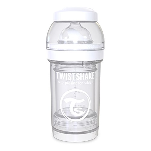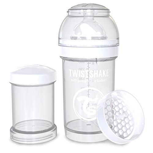 Twistshake is the perfect baby bottle to usebination with breastfeeding. Twistshake has developed the unique innovation twistflow, a system to actively reduce baby colic. The sensitive vault in the teat ventilates the bottle and prevents the creation of a vacuum, this helps reduce colic and also makes sure the flow of milk is even. The design of twistshakes teat closely resembles the likeness of the mothers breast to make the transition from breastfeeding to bottle-feeding both smooth and safe for you and baby. The slow flow teat is made from silicon and suitable from birth with an anti-colic valve to reduce baby colic. When mixing water and formula all you have to do is shake the bottle and the mixer net will dissolve any clumps within the milk keeping baby happy! the bottle has an extra wide neck, making it easy to refill and clean. Twistshake also has an ergonomically grip-friendly design for both baby and you and retains heat. Every twistshake contains a practical powder container so you can prepare your meal at home for when youre on the go. A container holds 100ml which is the equivalent of 1 serving of food. The smart design of twistshakes powder box makes feeding a both quick and simple task. Tips!rinse the bottle in water immediately after use to make clean-up even easier. If the liquid is heated in the bottle, the teat and the lid must be removed.