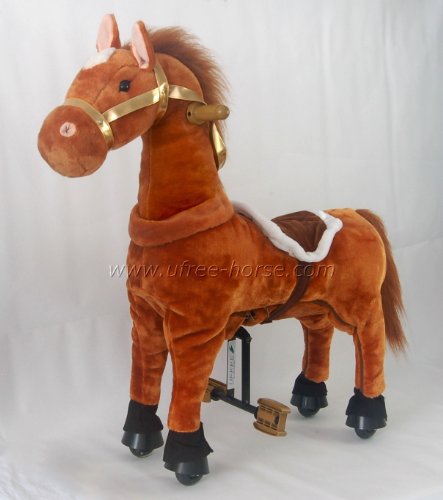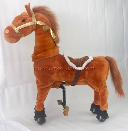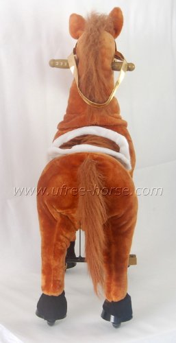 Hidding the raised seat, better appearance. To see the comparison of 3 size UFREE HORSE, please refer to the pictures beside the title. You probably loved to or wished you could ride horses and ponies when you were a kid. It's just something most kids love to do. Anyone can ride UFREE-HORSE, even you are not kid anymore. UFREE-HORSE has very similar appearance with the real horse. It uses high quality plush material and leather to make the appearance, covering the sturdy steel frame and complicated drive system. It is the syntheses of stuffed/plush toy, rocking horse toy and moving ride-on toy. The biggest characteristic is that it does not need any battery or petrol power to make it run. The action pony will run when rider's body bounce up and down pressing the saddle continually, just like the action of riding real horse. The horse could not only run in straight line, but also swerve even in the narrow room.UFREE-HORSE can be put in various places as your house, garden, squares, parks, footpath and amusement ground and any flat ground. UFREE-HORSE also can act as the amusement park ride equipment. Riders can play horse racing game together. Furthermore, it is good fitness equipment for the muscles of waist, abdomen and legs. UFREE-HORSE is a good toy for both children and adults. It has different dimension and two-position stirrup to meet different peoples' need from 3 years to adults. It will bring you the feeling of riding real horse. Kids will be very excited to leave their rocking hobby horse and jump on this walkable "real horse". UFREE-HORSE will bring the children an unforgettable childhood, and it will bring a happy life to each family. It will be the best gift for Christmas. As the exclusive manufacturer, UFREE welcome the ride on toy dealers and distributors to deal wholesale business. UFREE-HORSE approved CE (EN71 standard), and USA toy safety standard ASTM F963, tested by SGS, the world's leading testing and certification company.
