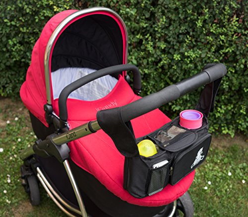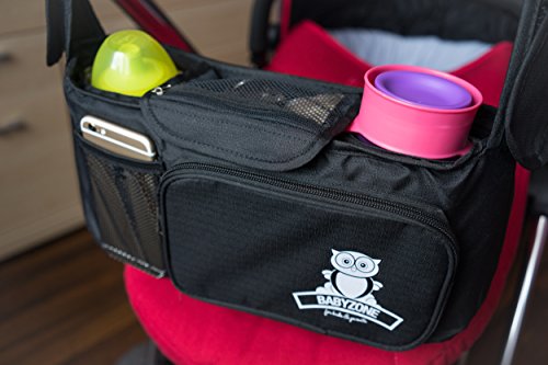 The durable, spacious Deluxe BabyZone Stroller Organiser keeps all of your essentials handy with plenty of storage options. That is why they are so popular. With its zippered pocket for valuables, insulated drink holders and insulated cargo bin, it's the perfect way to carry snacks, drinks and everything else. It fits on all strollers, pushchairs, prams or buggies like Umbrella, Uppa Baby, Britax, iCandy, Baby Jogger and many more. Features: Two insulated beverage holders keep cold drinks cold and warm drinks warm. An internal frame provides structure and creates effortless removal and replacement of bottles or cups. The large centre compartment easily fits diapers. Three outside pockets are easily accessible for small items such as cell phones, keys or snacks. The collapsible design does not interfere with the stroller fold.The organiser fits most strollers and even converts to a handy tote in seconds for more versatility. When you're out for a stroll with baby, digging through a diaper bag can be frustrating. The BabyZone Stroller Organiser keeps everything within reach for you and baby to conquer the long day ahead.