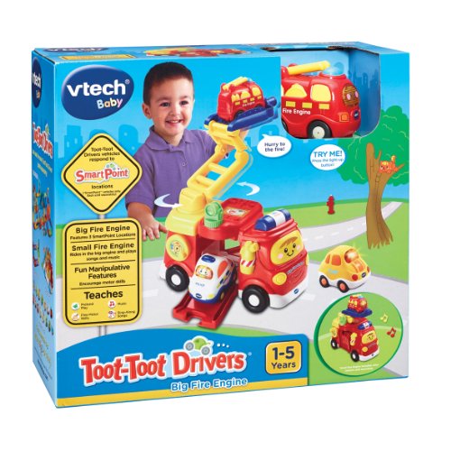 The Toot-Toot Drivers Big Fire Engine is full of fun. This chunky fire engine and its mini friend are perfectly sized for little hands. The big engine's manipulative features include an extending ladder, big press button, and sliding fire extinguisher; it also includes three SmartPoint locations that trigger fun sounds and phrases. Press the small fire engine's light-up screen to activate three sing-along songs, six melodies, and realistic sound effects.