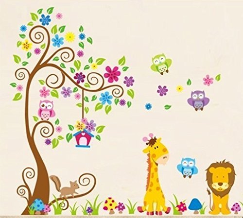 Verified Purchase This review is from: Wall Decal jungle forest lion and giraffe , squirrel owl on colorful tree wall stickers for nursery nursery bedroom