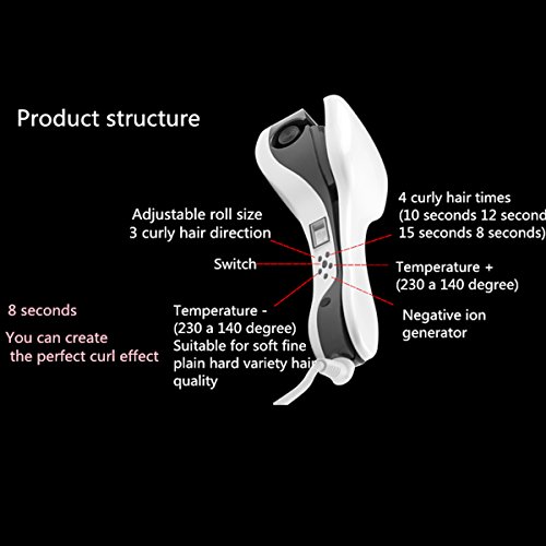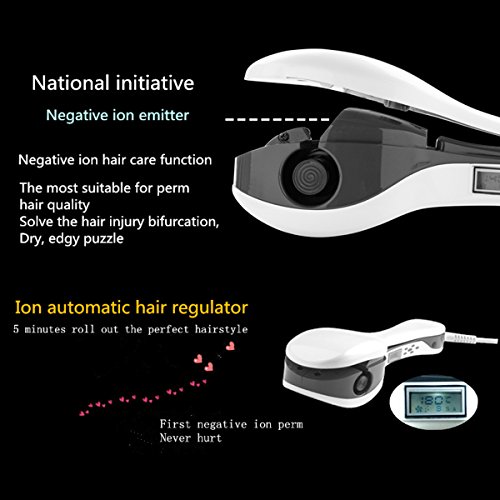 The system automatic curlers set temperature, time, direction, let curls design full control, and the perfect curl naturally balanced heating design, do not hurt the hair design, human anti-hot face design, intelligent work safety against electric shock design, automated system design, tangle-free hair does not pull hair clip sensor design and design for more than 10 years of life and many other innovative.