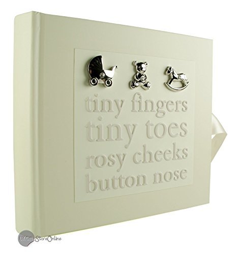 Baby photo album gift with 3D icons is perfect for holding those special memories safe of your little baby boy or girl. The outside of the photo album has a lovely beige finish making it perfect for either a boy or girl. Featured on the front are three 3D style silver topical baby designs which include a baby's pram, teddy bear and rocking horse. Underneath is the words our 'tiny fingers, tiny toes, rosy cheeks, button nose' in raised text. Inside the first page has a sleeve with titles in which to complete those precious first details as follows: Name: Date: Time of Birth: Weight: Length: Place: Then following are x 40 cream sleeves that each has a plastic sleeve in which to store a 6" x 4" photo on each side and also to write a small message next to. In total up to x80 photos can be safely stored. Baby photo album gift with 3D icons Measures: W: 18cm H: 17cm D: 4cm